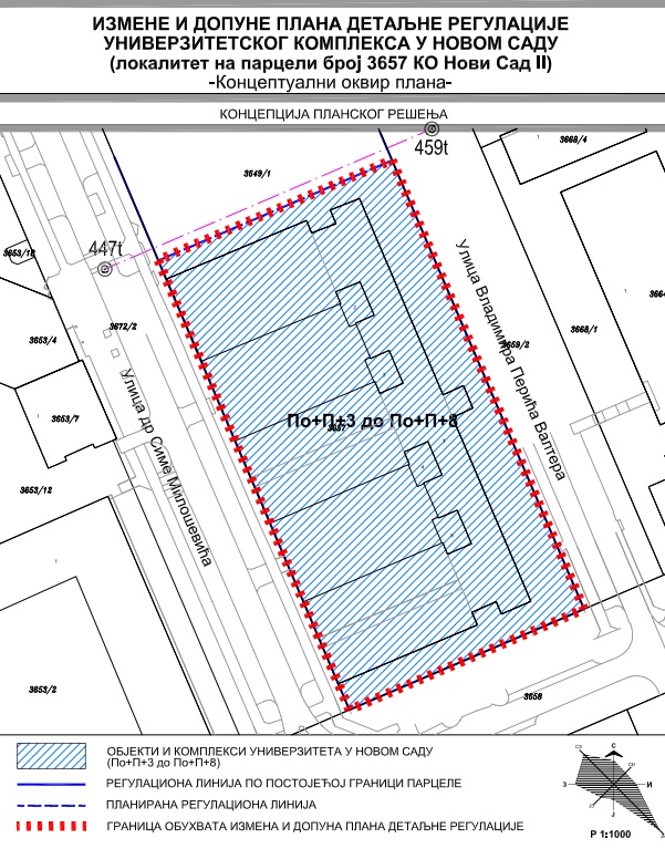 Одлуку о измени ПДР Универзитетског комплекса Скупштина Новог Сада усвојила је почетком октобра. Локалитет је, како су урбанисти у концептуалном оквиру планског документа објаснили, у целости површина јавне намене намењена образовању. Укупна бруто површина планираних објеката је 30.000 метара квадратних, висине од три до осам спратова (По+П+3 до По+П+8), са равним кровом, док је паркирање возила предвиђено у подземним етажама. Одређен број места биће издвојен за возила особа с инвалидитетом, а раније је нављено да ће по три паркинга на свакој етажи бити намењена за електрична возила, с пуњачима. Предложени колски приступи објекту су из улица Владимира Перића Валтера, Др Илије Ђуричића и Др Симе Милошевића.
