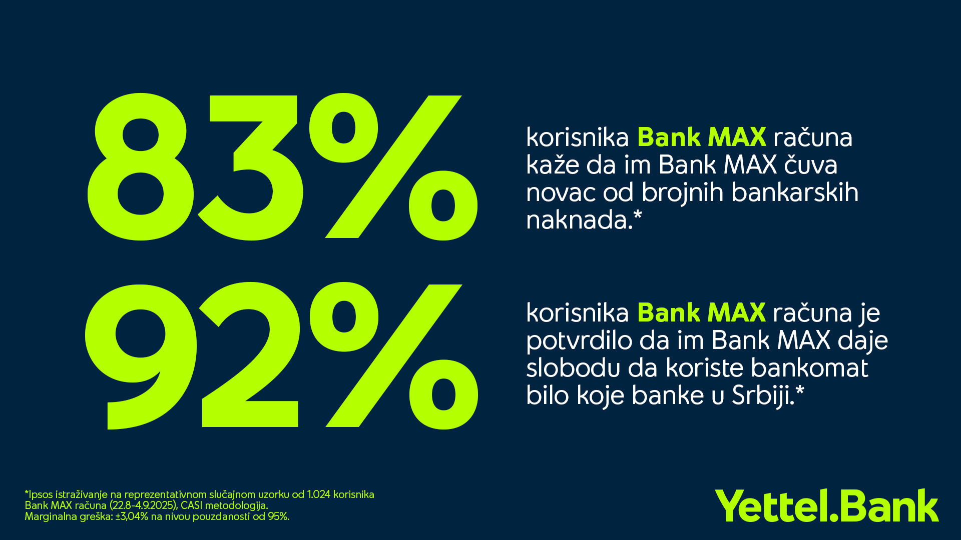 * Ipsos истраживање на репрезентативном случајном узорку од 1.024 корисника Bank MAX рачуна (22.8–4.9.2025), CASI методологија. Маргинална грешка: ±3,04% на нивоу поузданости од 95%.