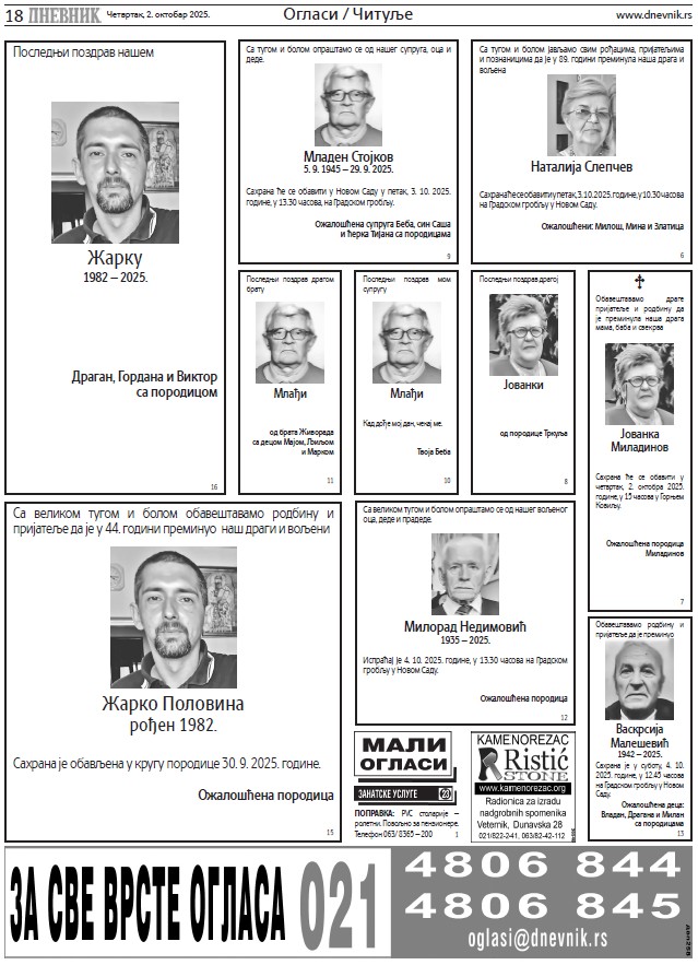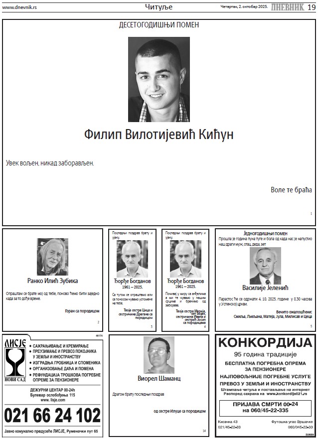 Читуље за четвртак, 2. октобар 2025.