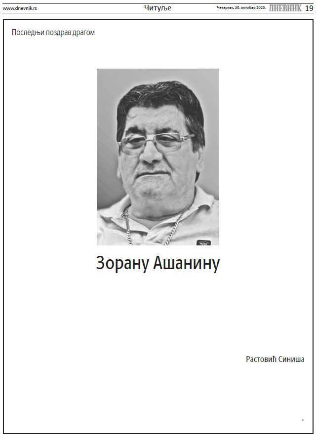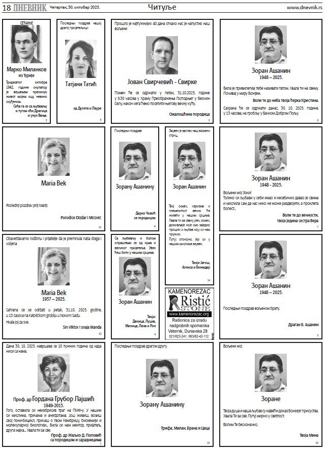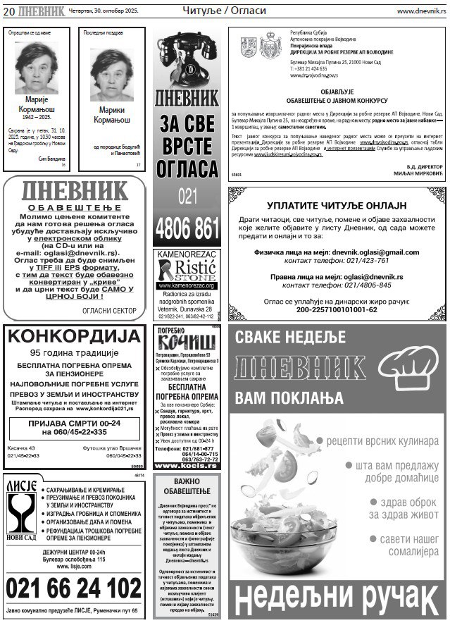 У шалтер сали Дневника, Булевар Михајла Пупина 15, читуље, помени и објаве захвалности за физичка лица предају се радним данима од 8 до 17, а суботом и недељом од 9 до 17 сати. Текст и фотографију за читуљу, помен или објаву захвалности (физичка лица) можете послати и мејлом: [email protected].