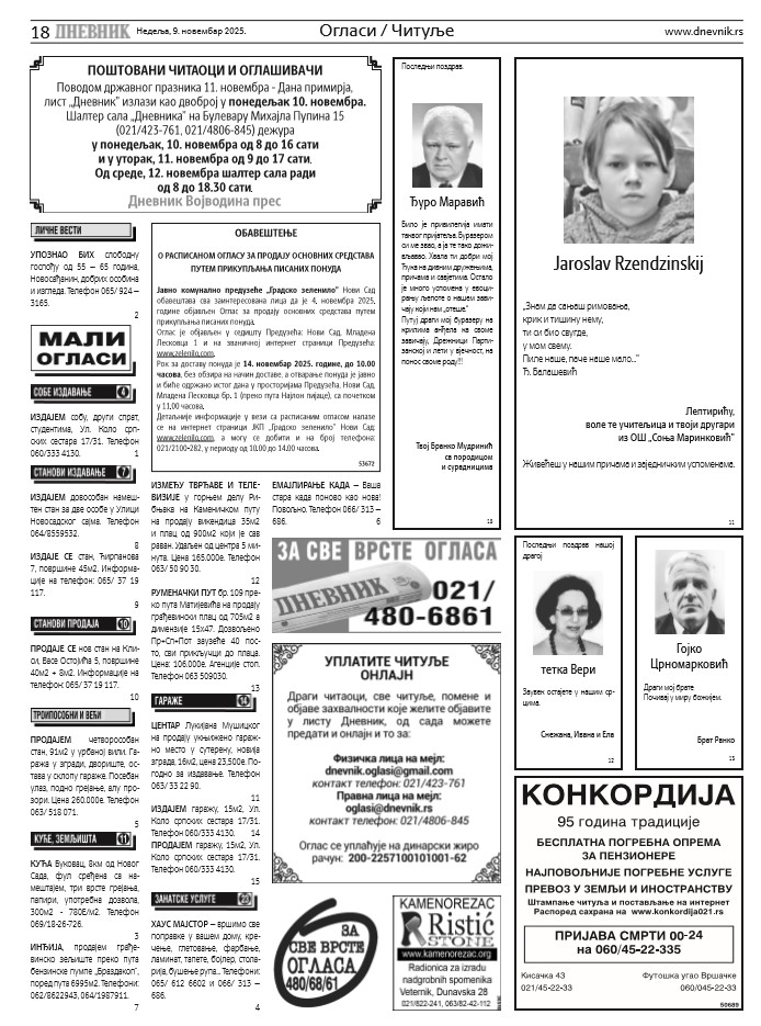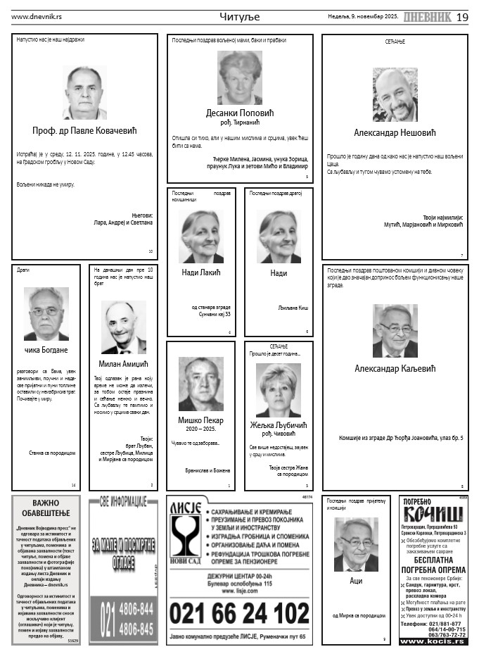 У шалтер сали Дневника, Булевар Михајла Пупина 15, читуље, помени и објаве захвалности  за физичка лица предају се радним данима од 8 до 17, а суботом и недељом од 9 до 17 сати. Текст и фотографију за читуљу, помен или објаву захвалности (физичка лица) можете послати и мејлом: [email protected]