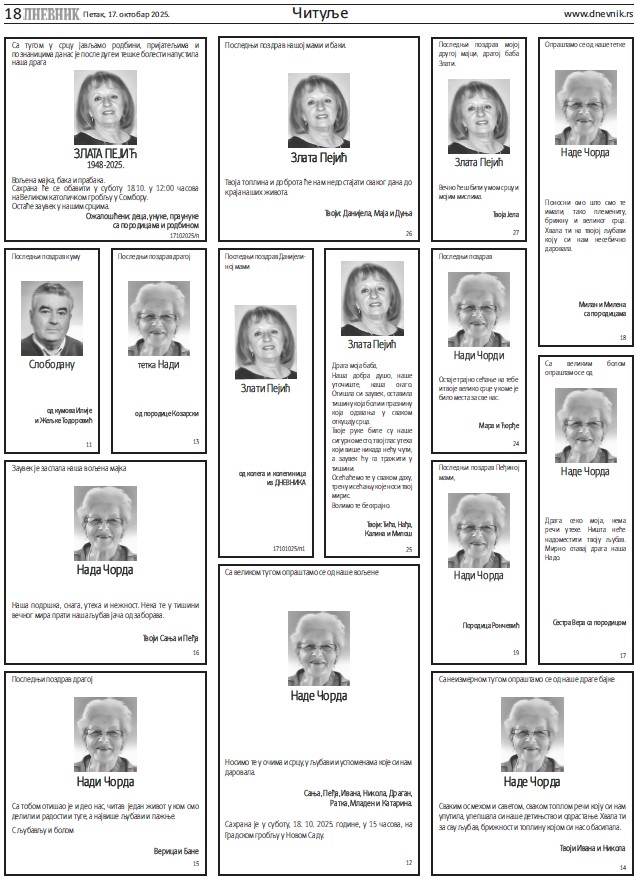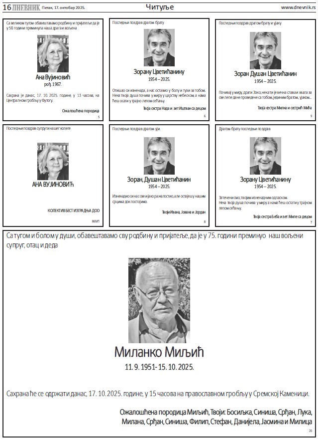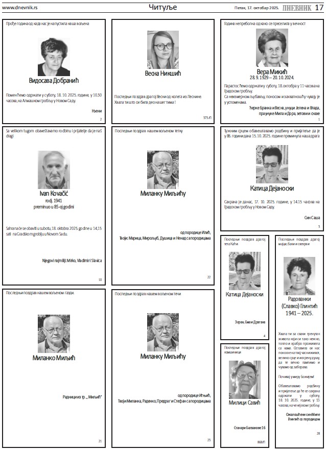 Читуље за петак, 17. октобар 2025.