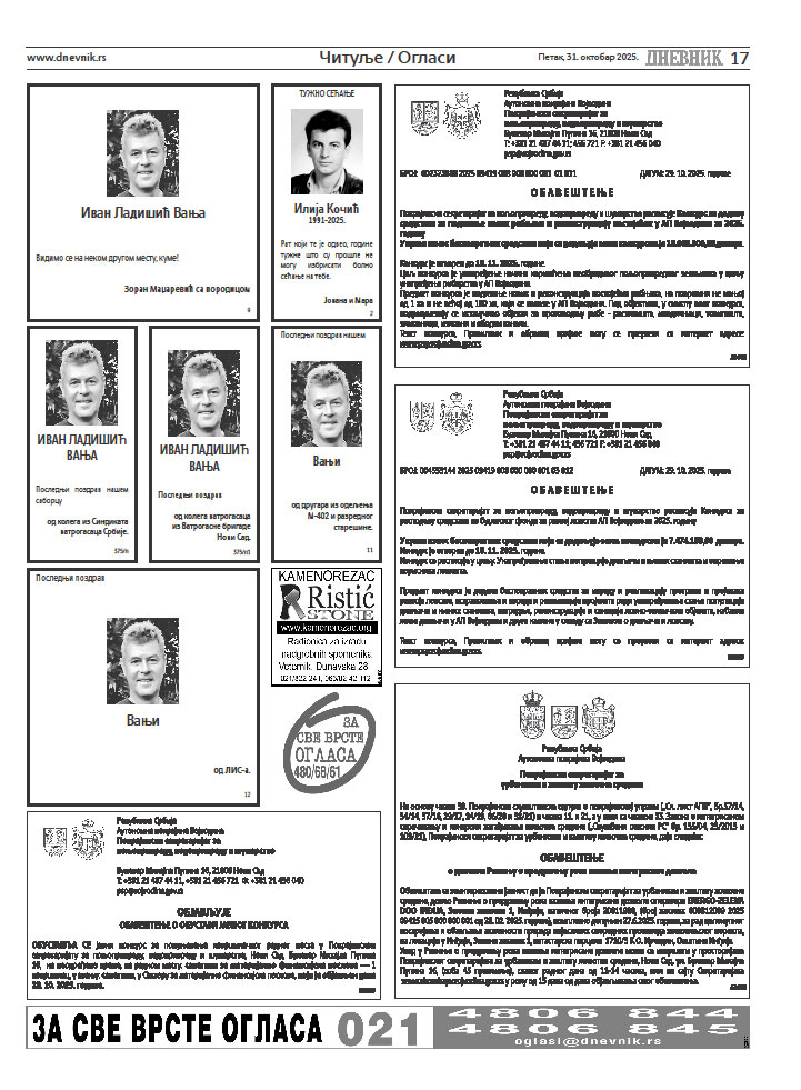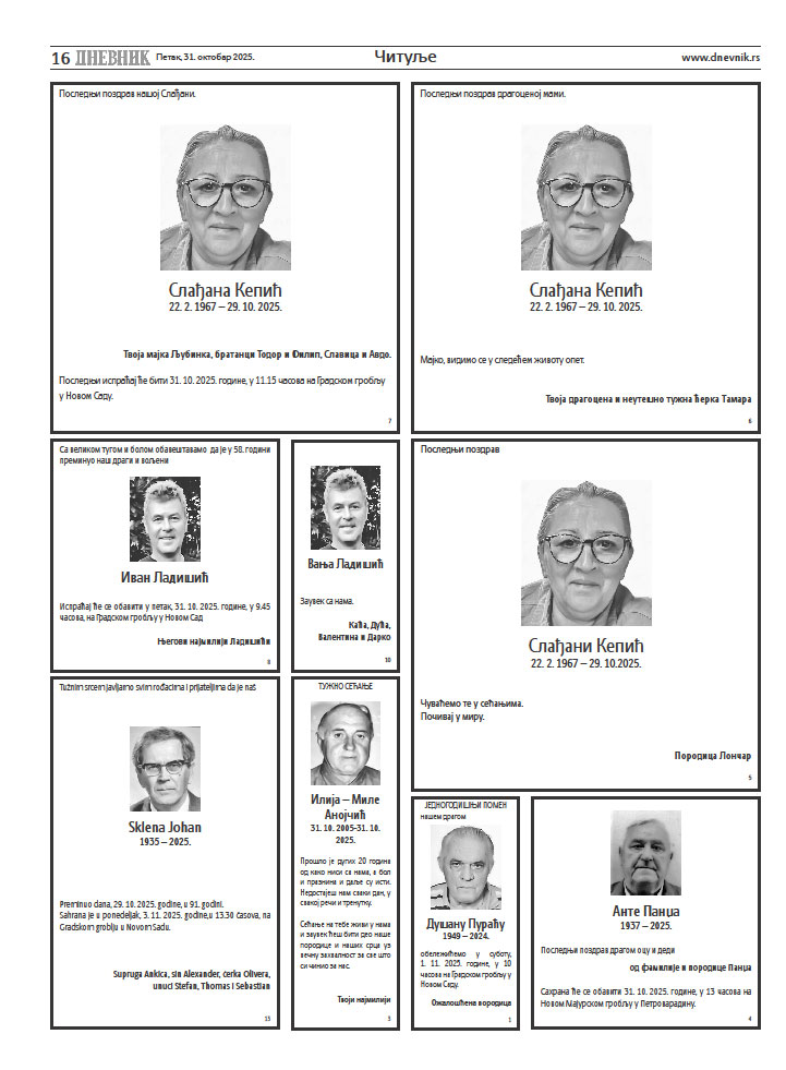У шалтер сали Дневника, Булевар Михајла Пупина 15, читуље, помени и објаве захвалности  за физичка лица предају се радним данима од 8 до 17, а суботом и недељом од 9 до 17 сати. Текст и фотографију за читуљу, помен или објаву захвалности (физичка лица) можете послати и мејлом: [email protected].