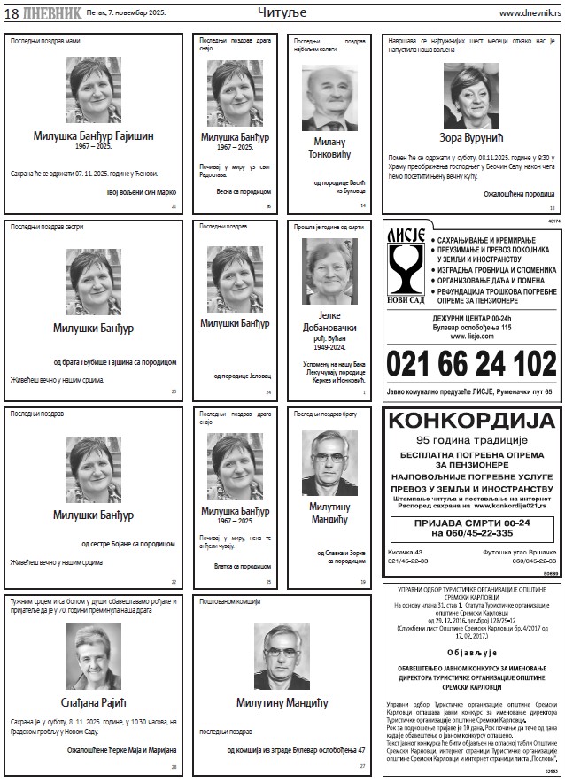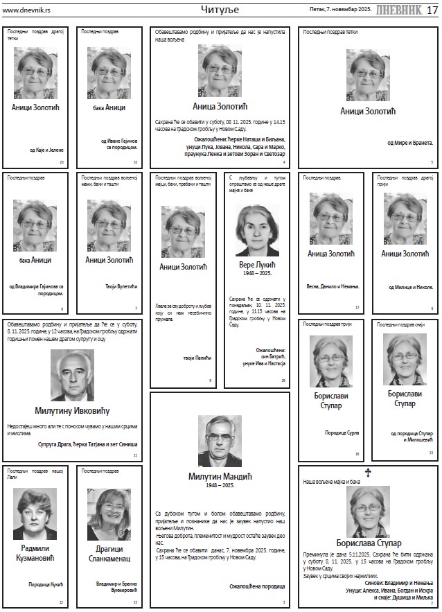 У шалтер сали Дневника, Булевар Михајла Пупина 15, читуље, помени и објаве захвалности за физичка лица предају се радним данима од 8 до 17, а суботом и недељом од 9 до 17 сати. Текст и фотографију за читуљу, помен или објаву захвалности (физичка лица) можете послати и мејлом: [email protected].