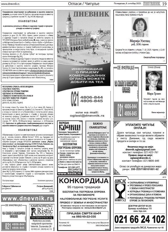 У шалтер сали Дневника, Булевар Михајла Пупина 15, читуље, помени и објаве захвалности за физичка лица предају се радним данима од 8 до 17, а суботом и недељом од 9 до 17 сати. Текст и фотографију за читуљу, помен или објаву захвалности (физичка лица) можете послати и мејлом: [email protected].