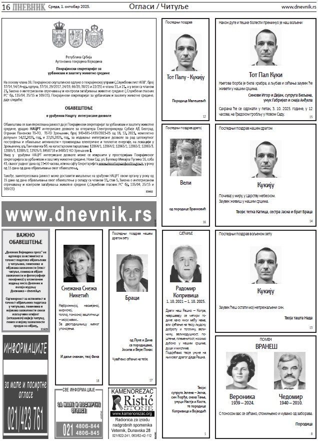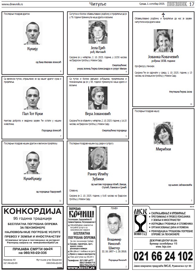 У шалтер сали Дневника, Булевар Михајла Пупина 15, читуље, помени и објаве захвалности за физичка лица предају се радним данима од 8 до 17, а суботом и недељом од 9 до 17 сати. Текст и фотографију за читуљу, помен или објаву захвалности (физичка лица) можете послати и мејлом: [email protected].