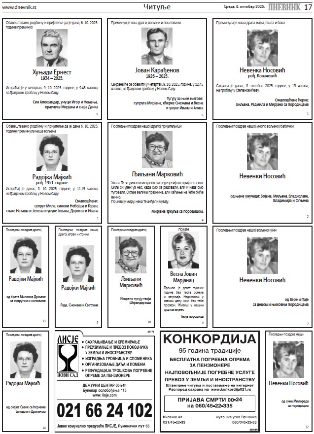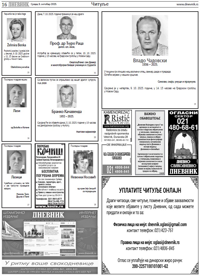 У шалтер сали Дневника, Булевар Михајла Пупина 15, читуље, помени и објаве захвалности за физичка лица предају се радним данима од 8 до 17, а суботом и недељом од 9 до 17 сати. Текст и фотографију за читуљу, помен или објаву захвалности (физичка лица) можете послати и мејлом: [email protected].