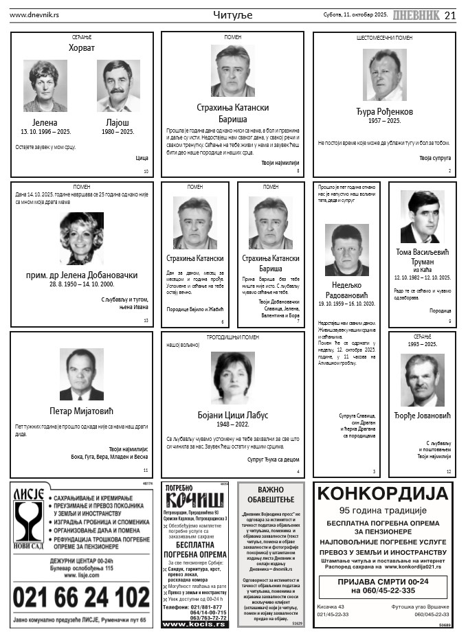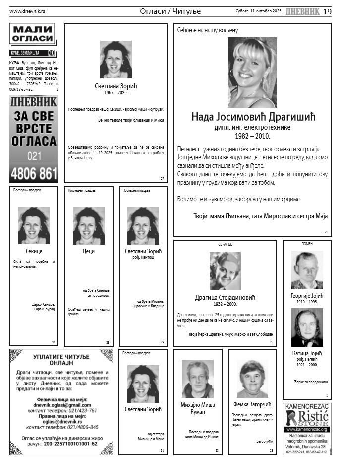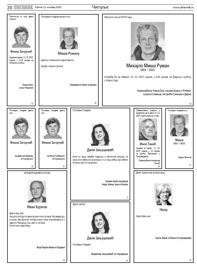 У шалтер сали Дневника, Булевар Михајла Пупина 15, читуље, помени и објаве захвалности за физичка лица предају се радним данима од 8 до 17, а суботом и недељом од 9 до 17 сати. Текст и фотографију за читуљу, помен или објаву захвалности (физичка лица) можете послати и мејлом: [email protected].