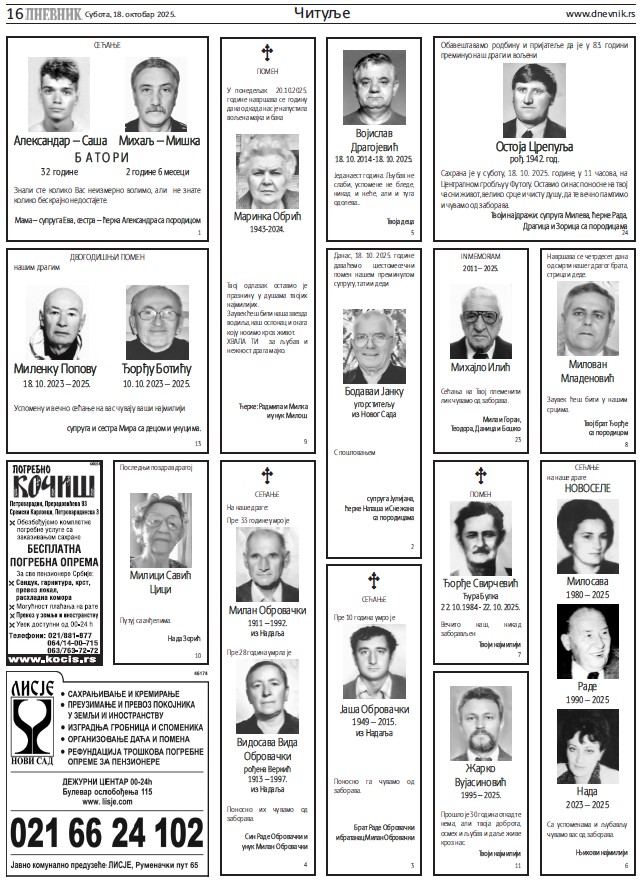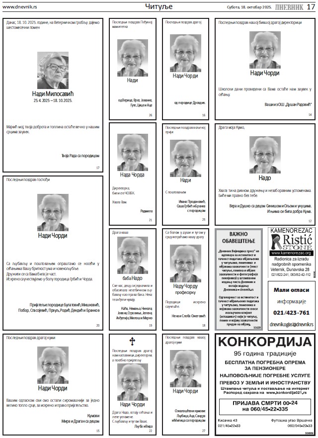 У шалтер сали Дневника, Булевар Михајла Пупина 15, читуље, помени и објаве захвалности за физичка лица предају се радним данима од 8 до 17, а суботом и недељом од 9 до 17 сати. Текст и фотографију за читуљу, помен или објаву захвалности (физичка лица) можете послати и мејлом: [email protected].