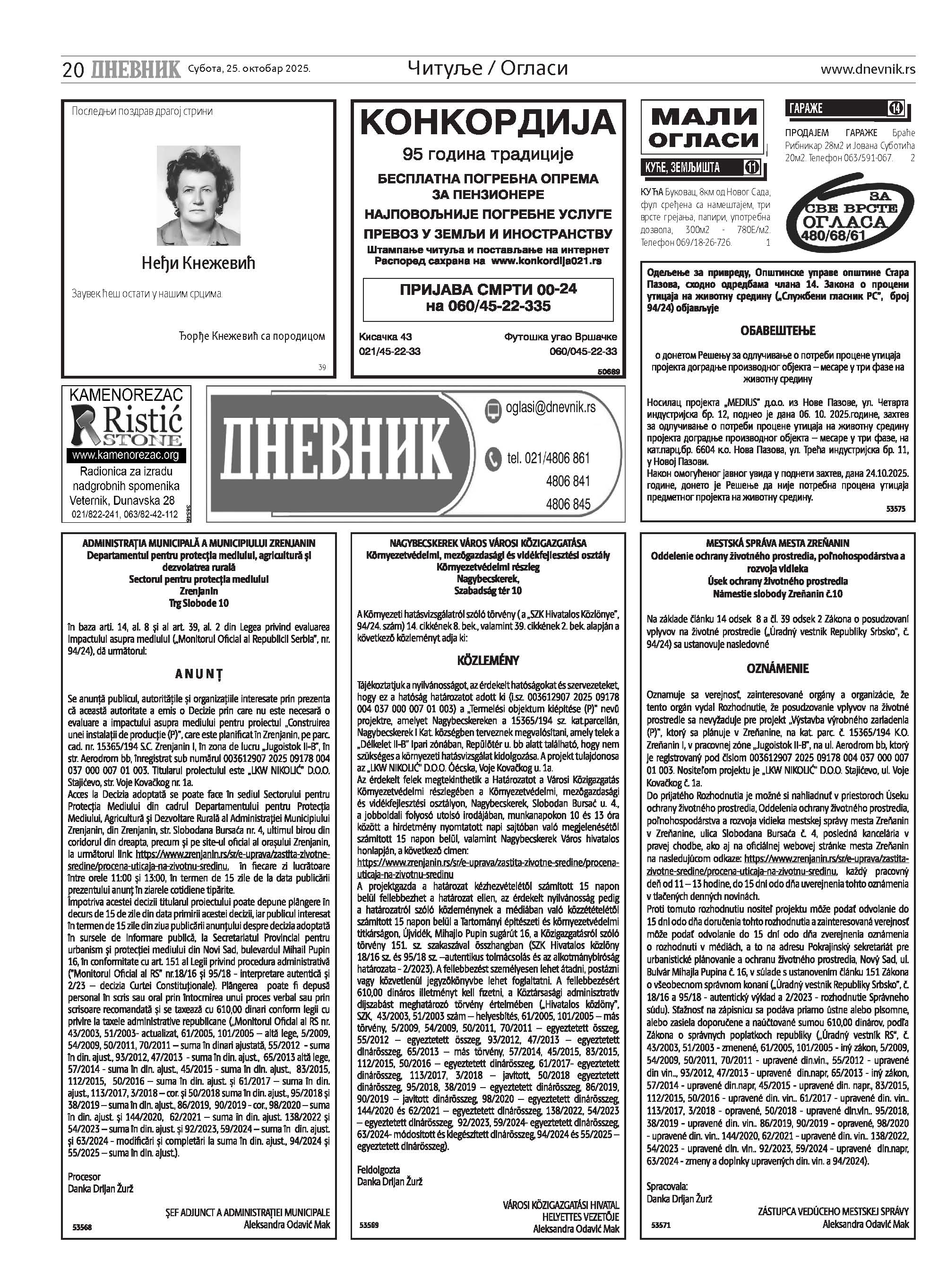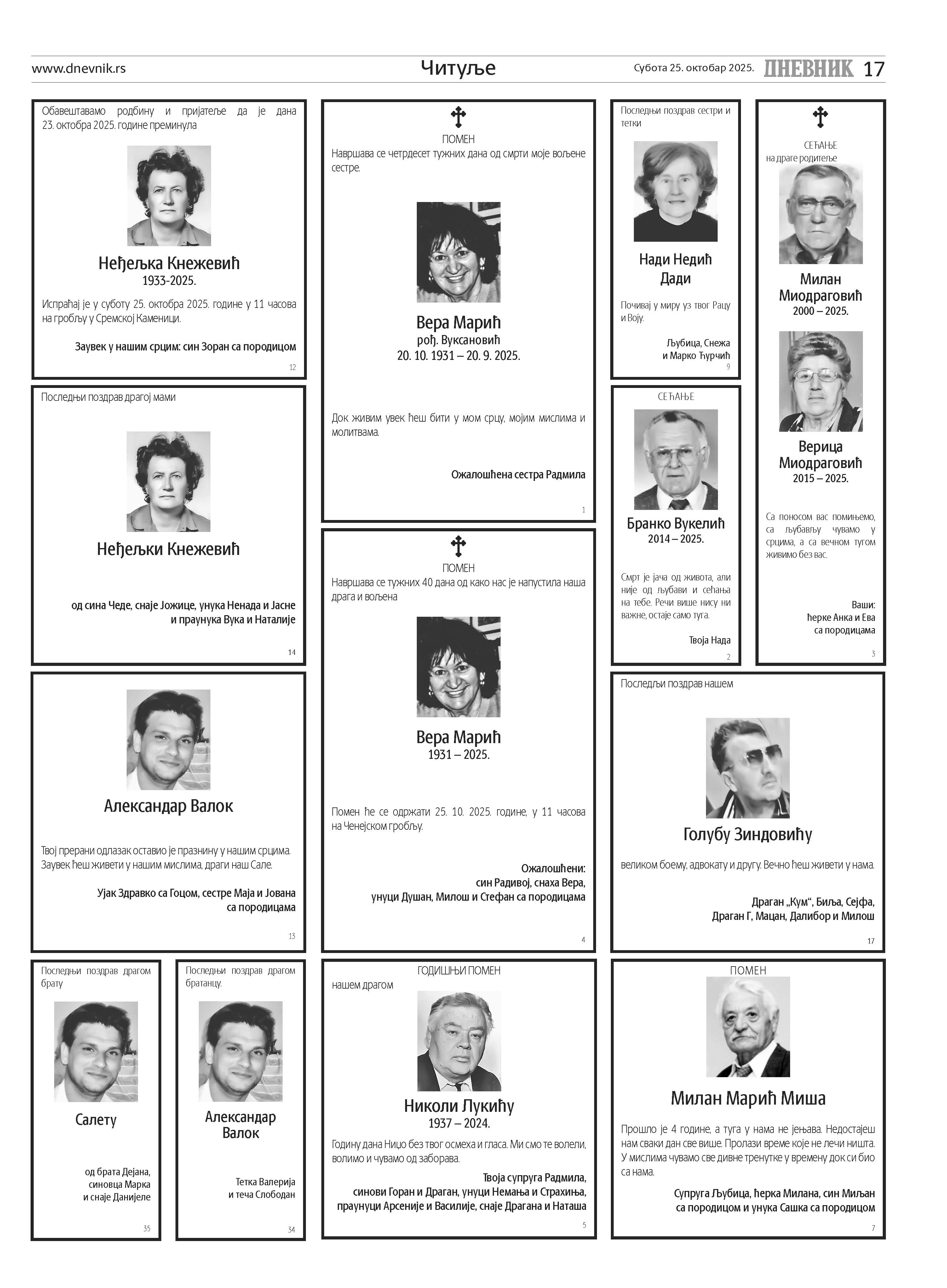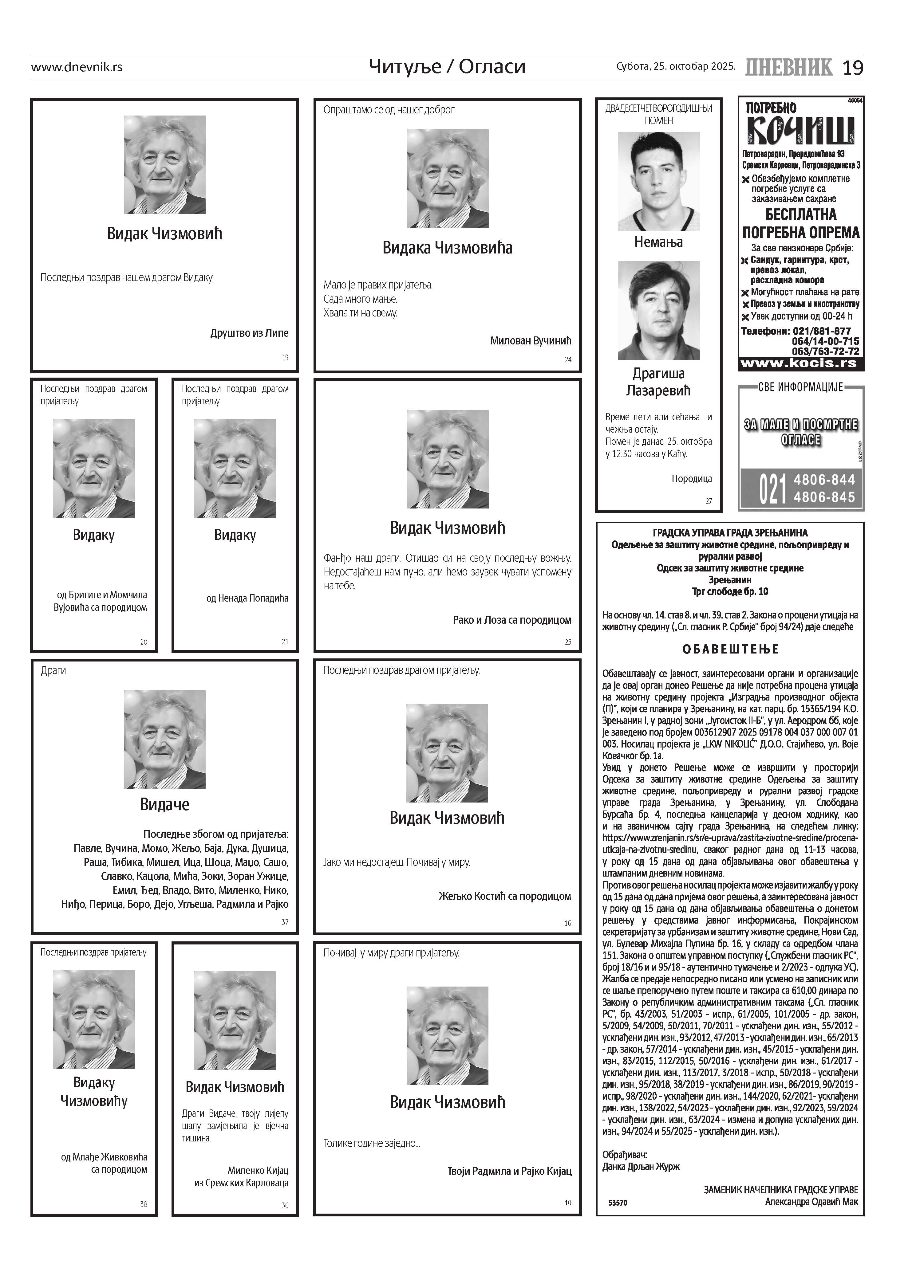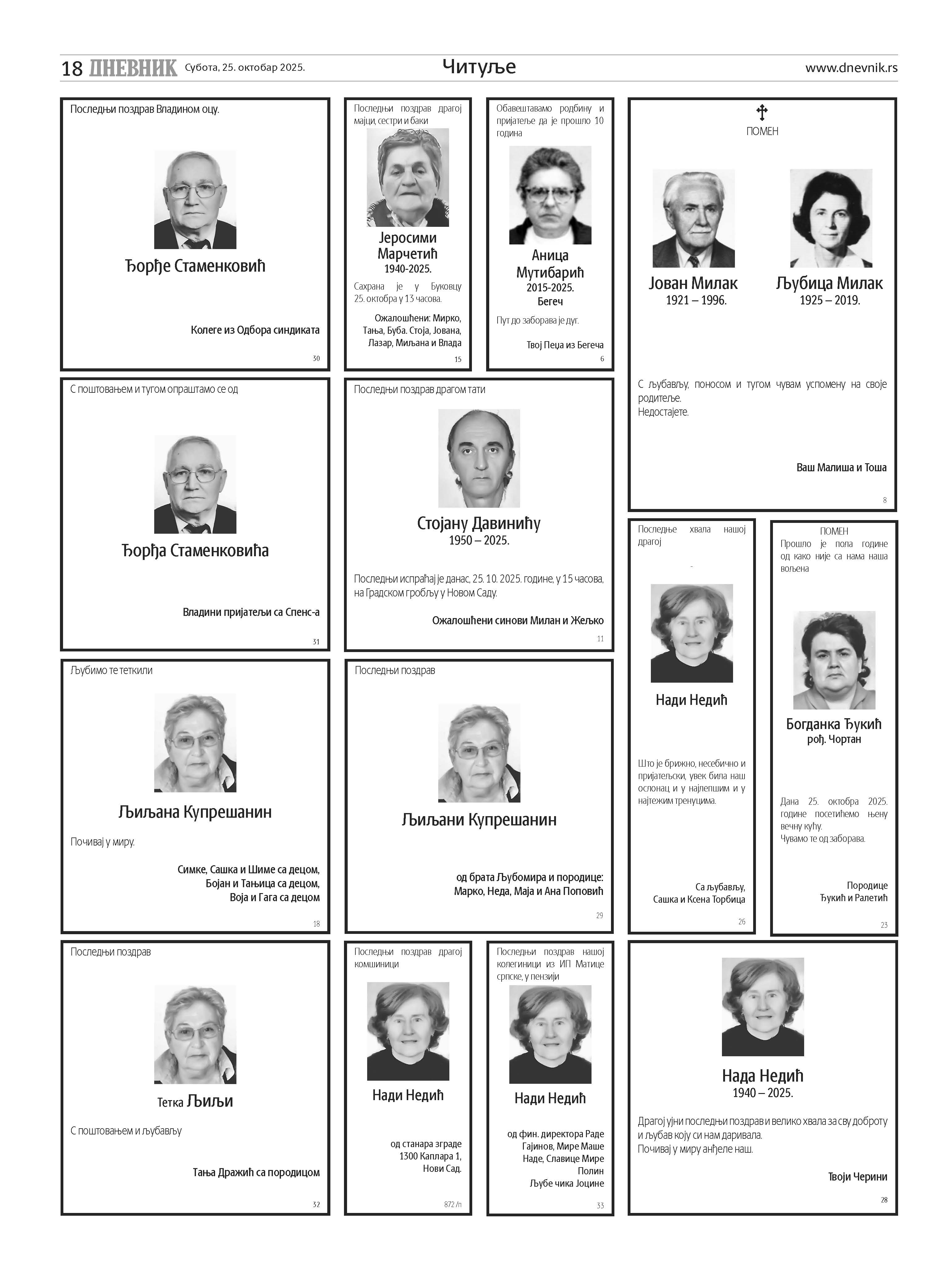 У шалтер сали Дневника, Булевар Михајла Пупина 15, читуље, помени и објаве захвалности за физичка лица предају се радним данима од 8 до 17, а суботом и недељом од 9 до 17 сати. Текст и фотографију за читуљу, помен или објаву захвалности (физичка лица) можете послати и мејлом: [email protected].