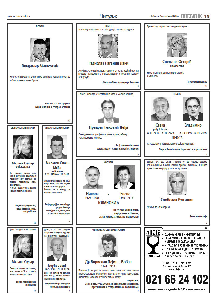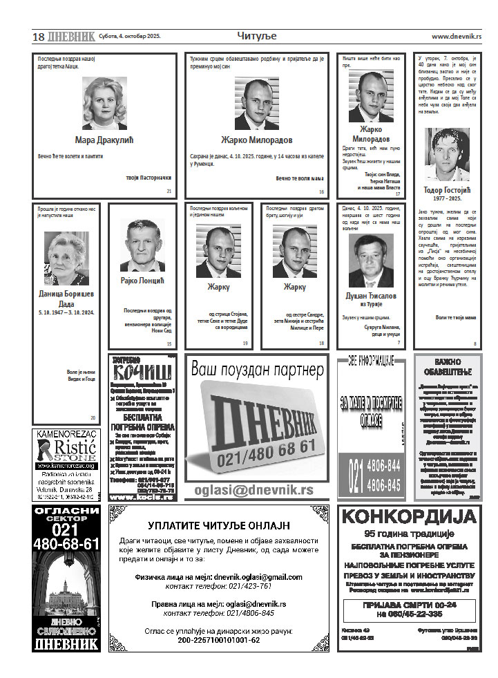 У шалтер сали Дневника, Булевар Михајла Пупина 15, читуље, помени и објаве захвалности за физичка лица предају се радним данима од 8 до 17, а суботом и недељом од 9 до 17 сати. Текст и фотографију за читуљу, помен или објаву захвалности (физичка лица) можете послати и мејлом: [email protected].