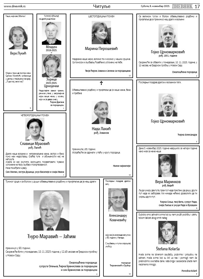 Čitulje, pomene i objave zahvalnosti koje želite objavite u listu Dnevnik i na sajtu www.dnevnik.rs možete predati u našoj šalter sali ili onlajn, odnosno mejlom.