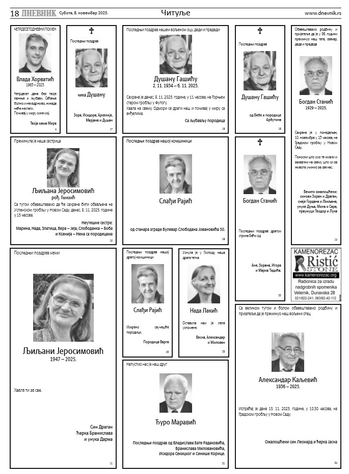 U šalter sali Dnevnika, Bulevar Mihajla Pupina 15, čitulje, pomeni i objave zahvalnosti za fizička lica predaju se radnim danima od 8 do 17, a subotom i nedeljom od 9 do 17 sati. Tekst i fotografiju za čitulju, pomen ili objavu zahvalnosti (fizička lica) možete poslati i mejlom: [email protected].