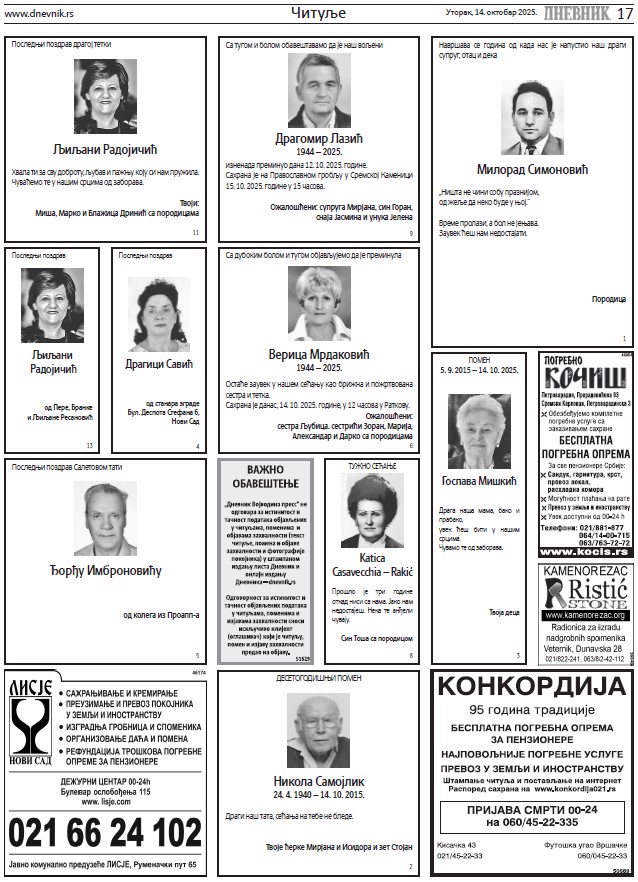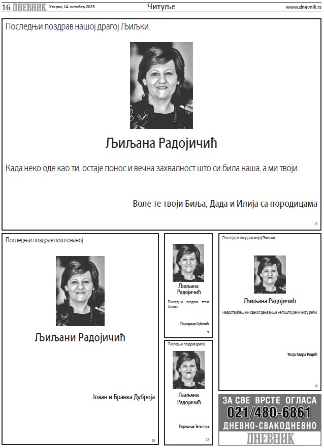 У шалтер сали Дневника, Булевар Михајла Пупина 15, читуље, помени и објаве захвалности за физичка лица предају се радним данима од 8 до 17, а суботом и недељом од 9 до 17 сати. Текст и фотографију за читуљу, помен или објаву захвалности (физичка лица) можете послати и мејлом: [email protected].