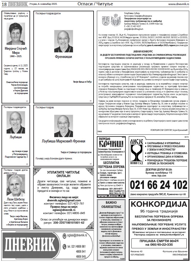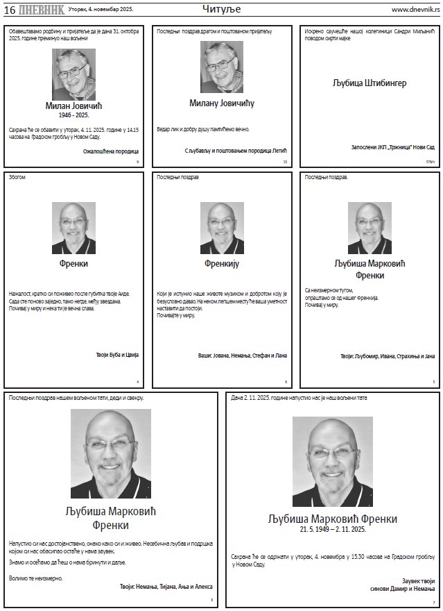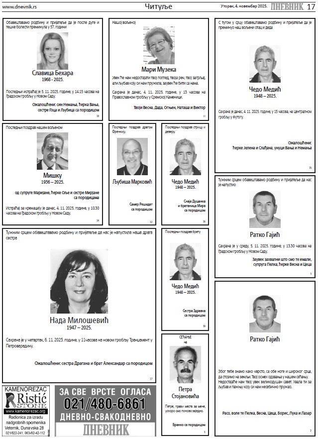 У шалтер сали Дневника, Булевар Михајла Пупина 15, читуље, помени и објаве захвалности за физичка лица предају се радним данима од 8 до 17, а суботом и недељом од 9 до 17 сати. Текст и фотографију за читуљу, помен или објаву захвалности (физичка лица) можете послати и мејлом: [email protected].