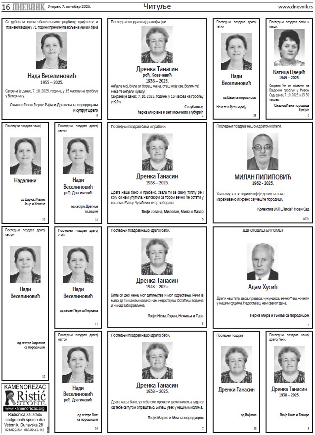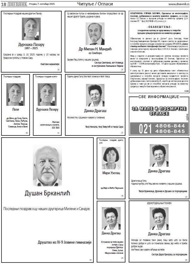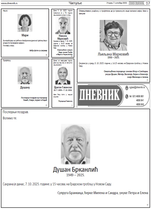 У шалтер сали Дневника, Булевар Михајла Пупина 15, читуље, помени и објаве захвалности за физичка лица предају се радним данима од 8 до 17, а суботом и недељом од 9 до 17 сати. Текст и фотографију за читуљу, помен или објаву захвалности (физичка лица) можете послати и мејлом: [email protected].