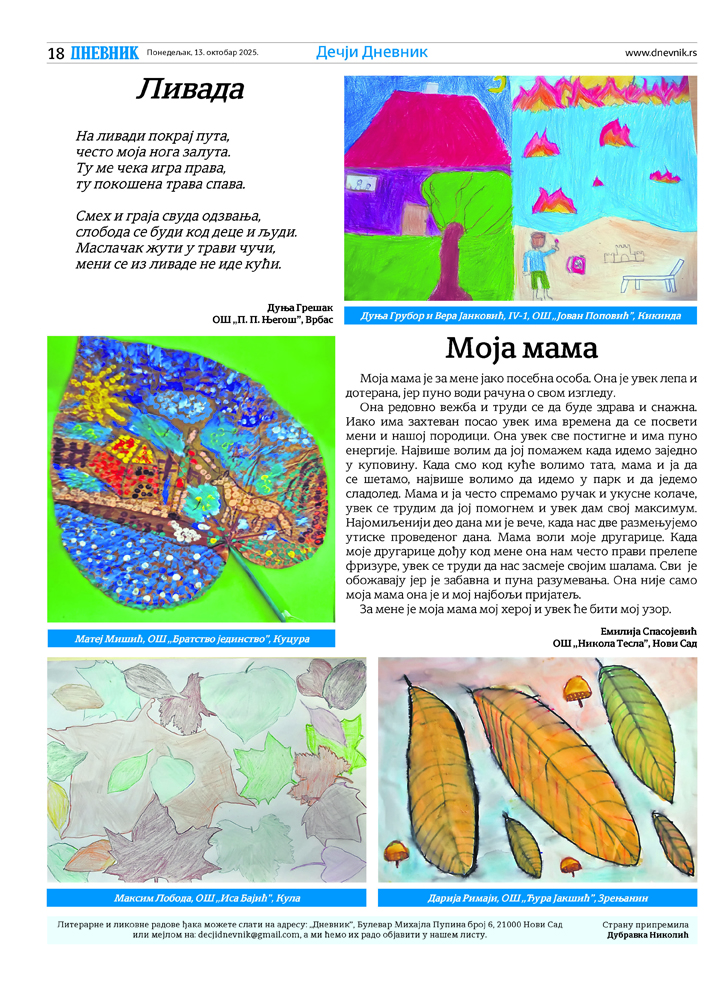 Литерарне и ликовне радове ђака можете слати на адресу: „Дневник“, Булевар Михајла Пупина број 6, 21000 Нови Сад, мејлом на: [email protected], а ми ћемо их радо објавити у нашем листу.