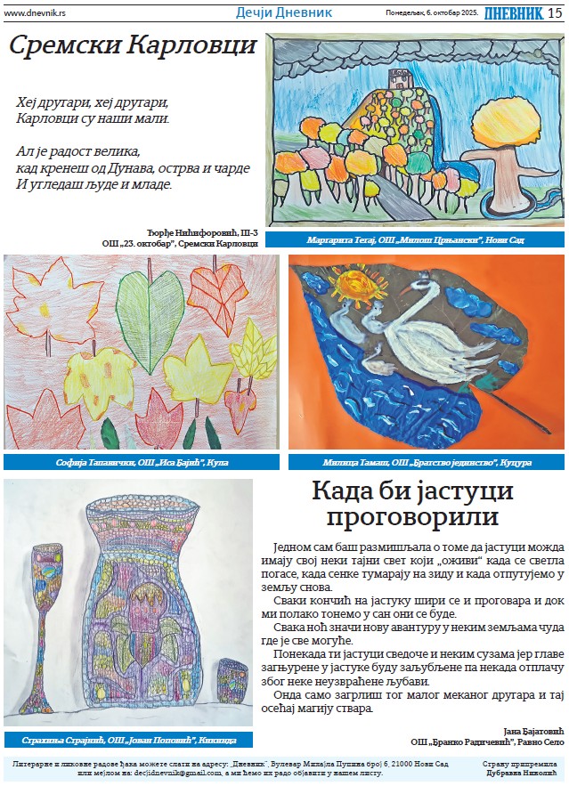 Литерарне и ликовне радове ђака можете слати на адресу: „Дневник“, Булевар Михајла Пупина број 6, 21000 Нови Сад, мејлом на: [email protected], а ми ћемо их радо објавити у нашем листу.