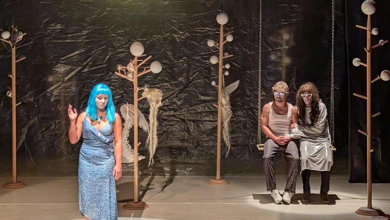 И поред мрака који приказује, захвљајући луцидности редитељке Ане Чаби, представа “Анђели међу крошњама” има веома театралан, слављенички сјај. Костими са крилима, шљокицама, бела шминка преко лица глумаца, празнична светла, карневалског су, или кабаретског типа. Иза трагедије провејава комедија, што је веома гротескан поступак који колико олакшава, толико и истиче смртну озбиљност уметничког обликовања.