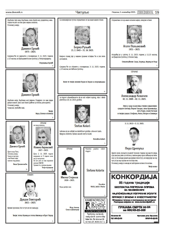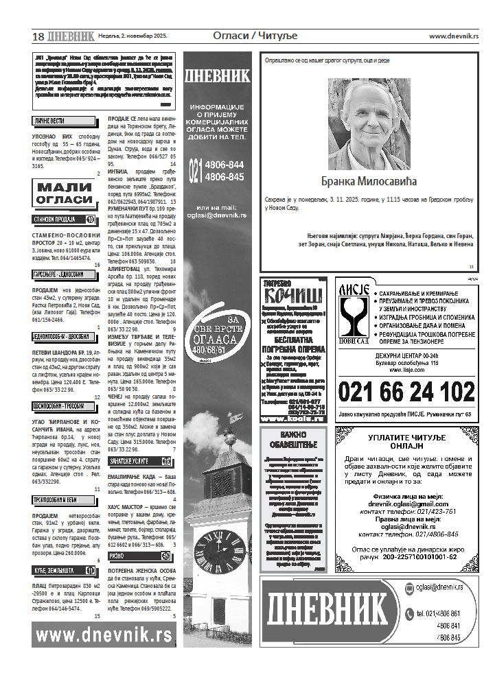 Čitulje, pomene i objave zahvalnosti koje želite objavite u listu Dnevnik i na sajtu www.dnevnik.rs možete predati u našoj šalter sali ili onlajn, odnosno mejlom.