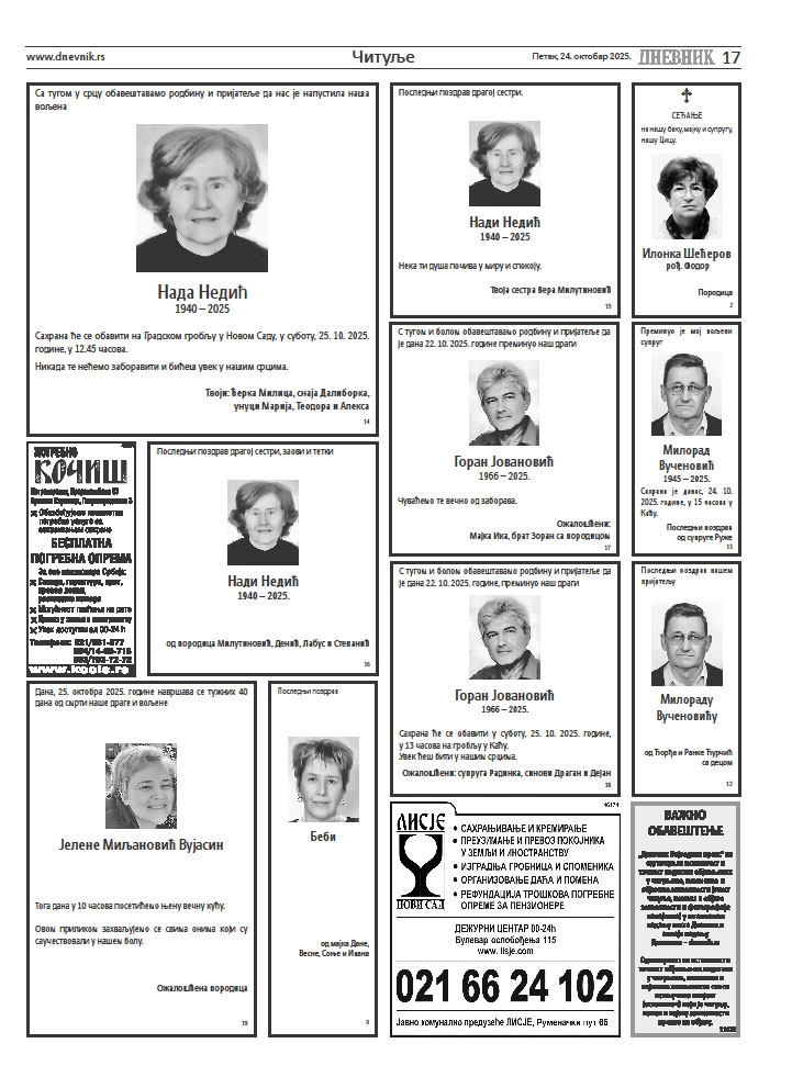 U šalter sali Dnevnika, Bulevar Mihajla Pupina 15, čitulje, pomeni i objave zahvalnosti  za fizička lica predaju se radnim danima od 8 do 17, a subotom i nedeljom od 9 do 17 sati. Tekst i fotografiju za čitulju, pomen ili objavu zahvalnosti (fizička lica) možete poslati i mejlom: [email protected]