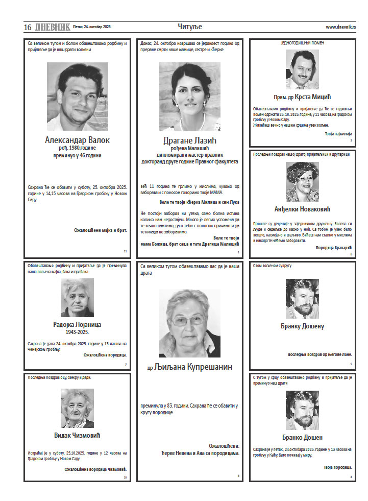 Čitulje, pomene i objave zahvalnosti koje želite objavite u listu Dnevnik i na sajtu www.dnevnik.rs možete predati u našoj šalter sali ili onlajn, odnosno mejlom.
