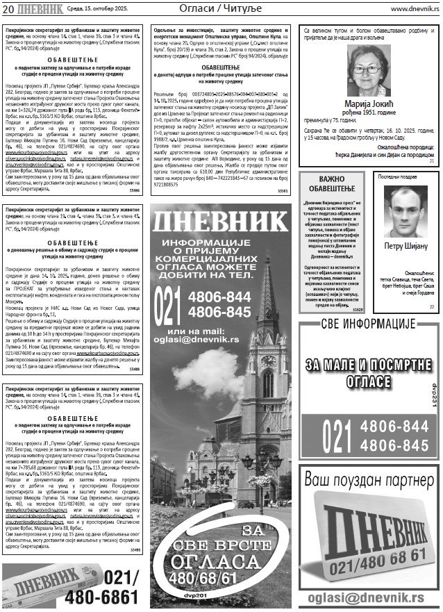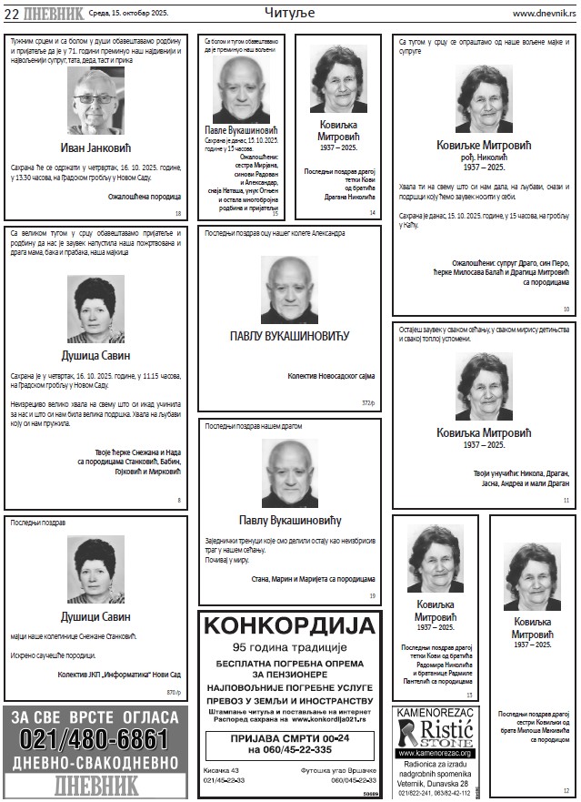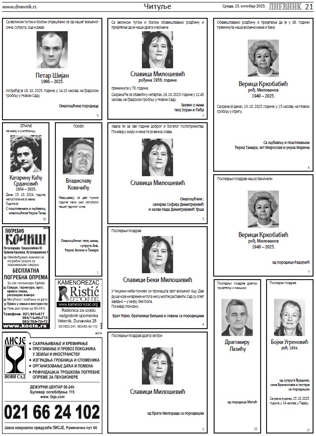 Čitulje za sredu, 15. oktobar 2025.