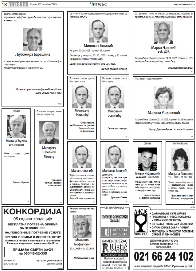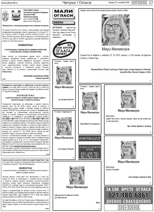 U šalter sali Dnevnika, Bulevar Mihajla Pupina 15, čitulje, pomeni i objave zahvalnosti za fizička lica predaju se radnim danima od 8 do 17, a subotom i nedeljom od 9 do 17 sati. Tekst i fotografiju za čitulju, pomen ili objavu zahvalnosti (fizička lica) možete poslati i mejlom: [email protected].