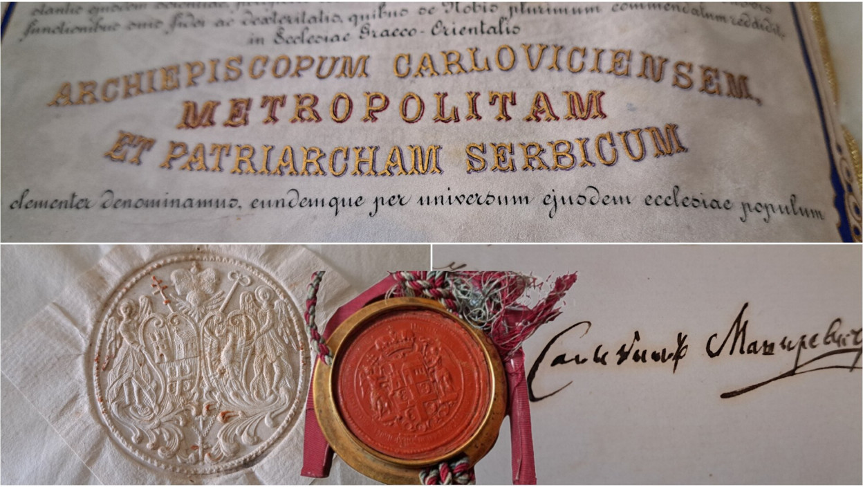 – Postavka se zasniva na reprodukcijama, ali i originalnim dokumentima srpske crkvene istorije – kaže Pilipović. – Katalog i sama postavka se u potpunosti zasnivaju na dokumentima koji potiču iz Arhiva SPC u Sremskim Karlovcima. Naročito se ističu pečati srpskih mitropolita iz prve polovine 18. veka kao što su Vikentije Jovanoviće, Mojsije Petrović, kao i Pavlu Nenadović, Mojsej Putnik i Stefan Stratimirović. Radi su o otiscima u vosku, kao i o suvim žigovima na papiru.