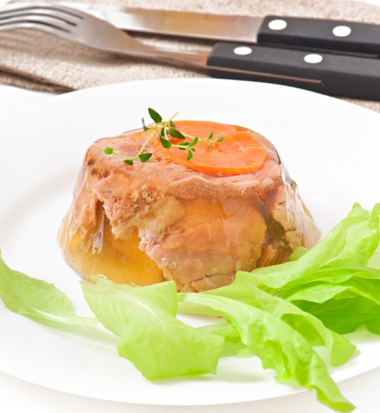 test pokaže da je sve kako treba, sklonite lonac sa ringle i kašikom uklonite sloj masnoće koji se nakupio na vrhu.Tečnost procedite kroz gusto cedilo i sipajte je preko sitno usitnjenog mesa u odgovarajuće posude. Zatim ostavite da se potpuno ohladi i stegne u frižideru ili na hladnom mestu.