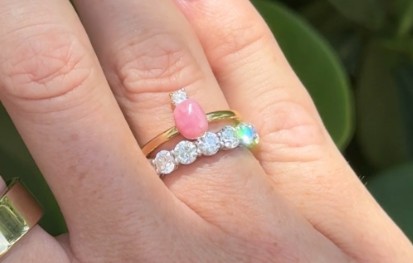 @rebeccawinship the ring that went viral (people either love or hate her lol) - now part of my wedding band stack 💍🐚 still can’t believe I found this pearl in a conch fritter!! #customring #jewelrytok #ring #storytime #heirloom #weddingband ♬ money trees kendrick - kenny❕