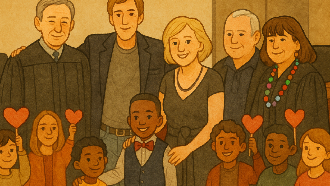 Na klupi pored novih roditelja u sudu okruga Kent, Majkla su okružili drugari koji su mahali papirnim srcima dok je sudija Patriša Gardner zvanično okončavala proces usvajanja.