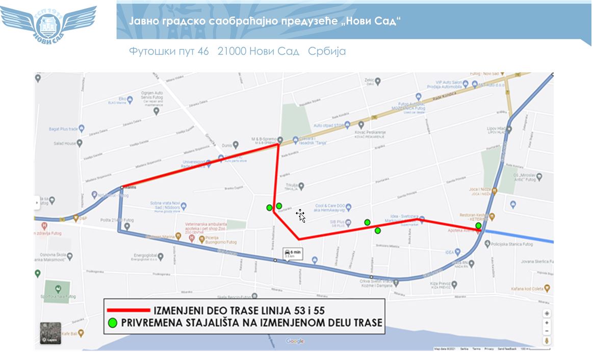 Polasci iz Novog Sada za Futog odvijaće se redovnom trasom do raskrsnice Cara Lazara / Braće Bošnjak / Svetozara Markovića, nakon čega će autobusi nastavljati Ulicom Svetozara Markovića, zatim skretati desno u Partizansku ulicu, potom desno u Ulicu Branka Radičevića, pa levo u Ulicu Rade Kondića, i dalje će saobraćati uobičajenom trasom.