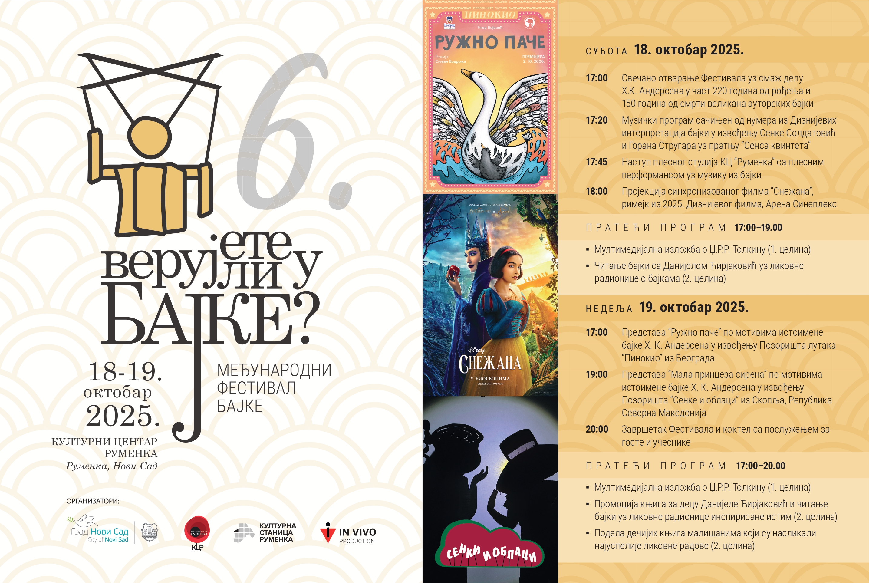 U Kulturnom centru Rumenka, Oslobođenja 26, večeras sa početkom u 17 časova svečano će biti otvoren šesti Festival bajke „Verujete li u bajke“, uz prisustvo zvaničnika Grada Novog Sada.