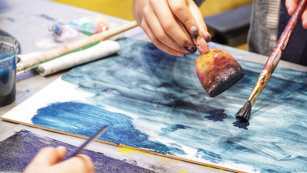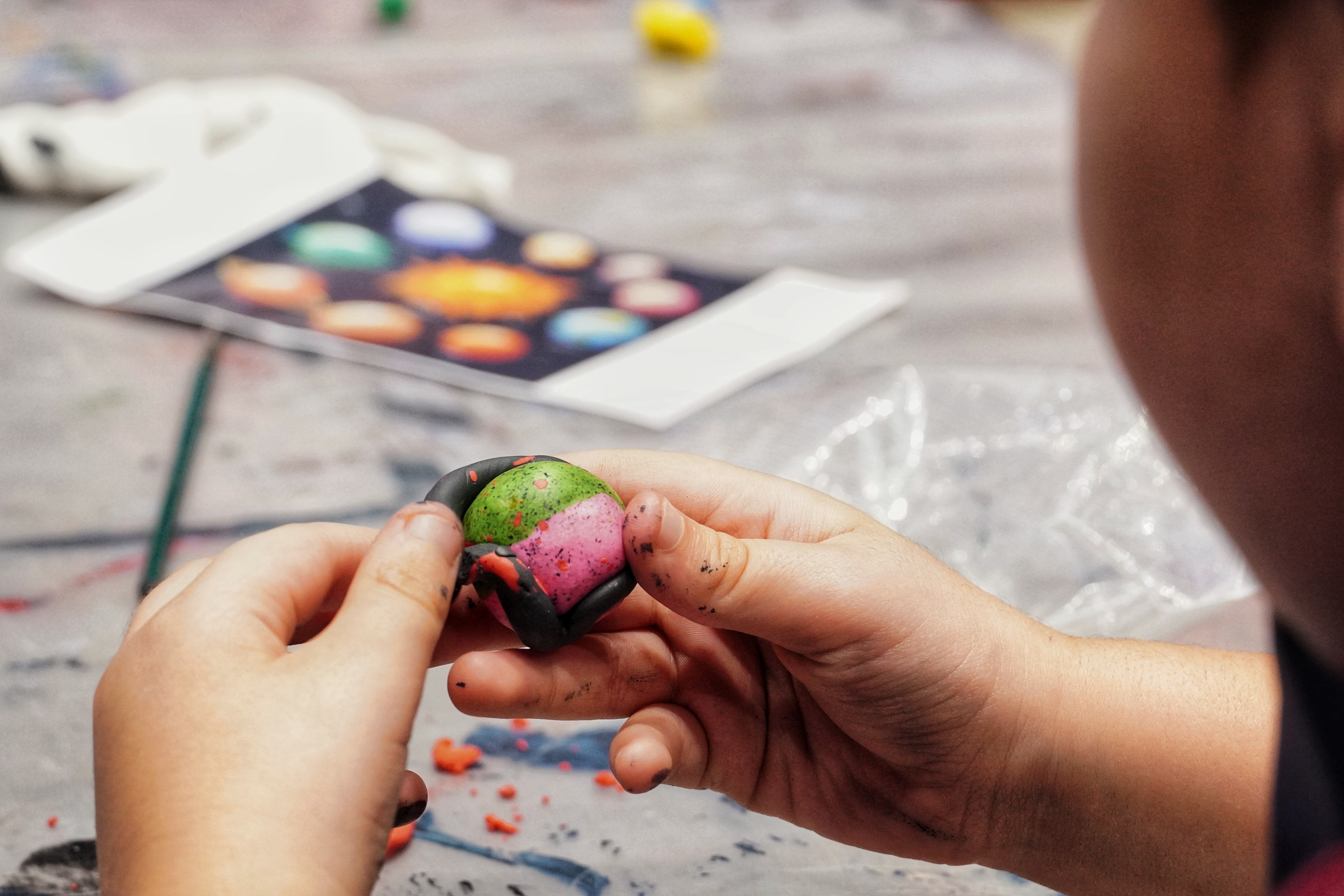 Una je pripremila na papiru tamnu kosmiču pozadinu koju će ispuniti sistemi glinenih planeta i zvezda, a u uglu pozadine stvaranje zvezdanog sistema posmatra naslikani mali zeleni vanzemaljac.