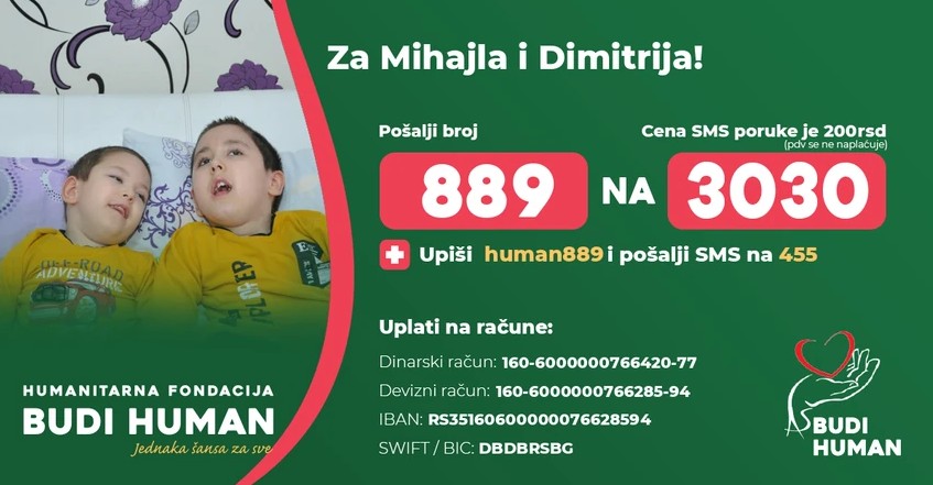 Mihajlu možete pomoći slanjem SMS poruke (jednokratna pomoć 200 dinara) sadržaja 889 na 3030.