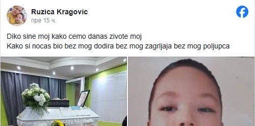 Diko sine moj kako ćemo danas živote moj? Kako si noćas bio bez mog dodira bez mog zagrljaja bez mog poljupca? Moj sin moj život ne zaslužuje ništa crno. Bio si svetlost, bio si sve. Napustio me je, moj život se ugasio, kako ću ja da preživim?, napisala je ona na Fejsbuku.