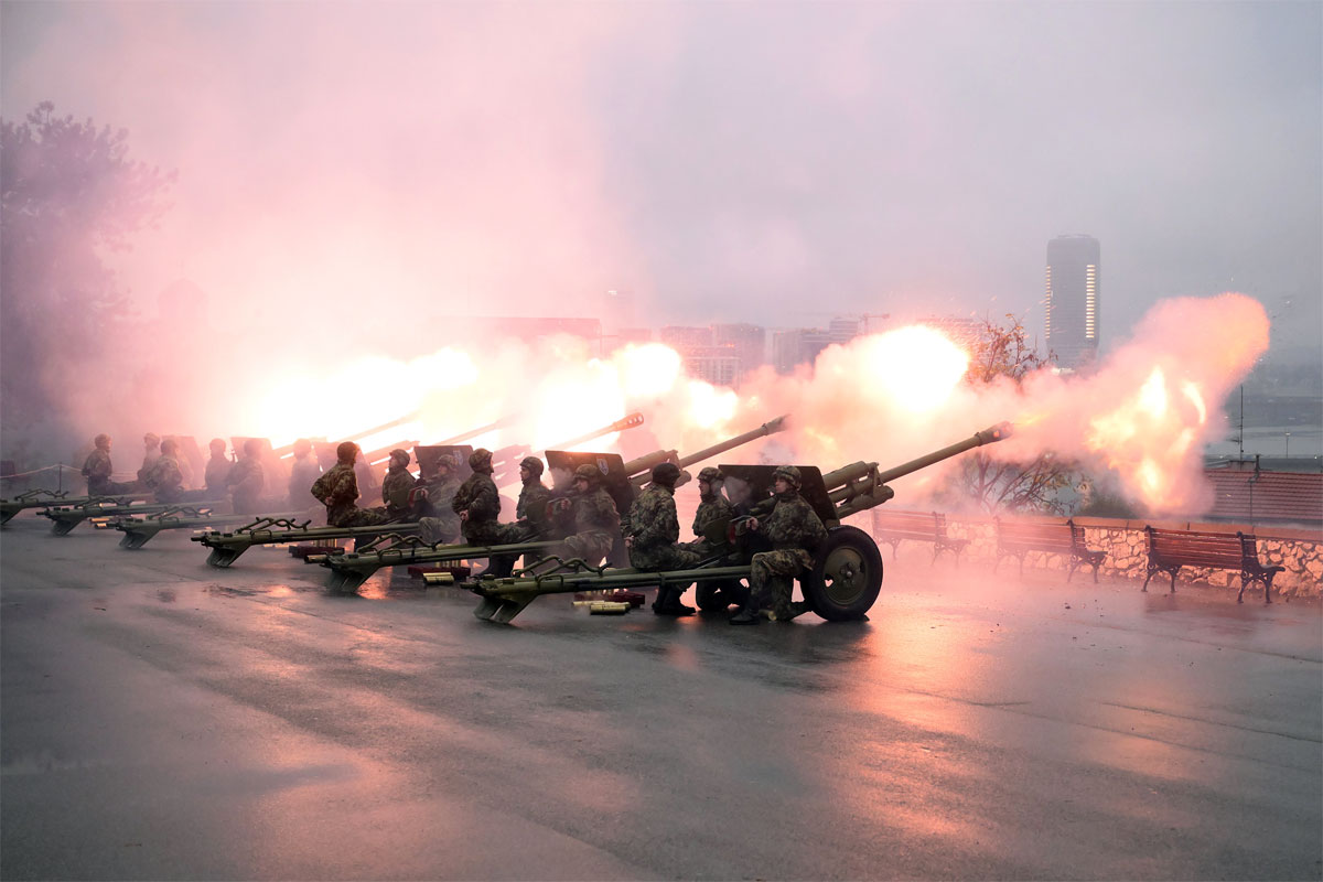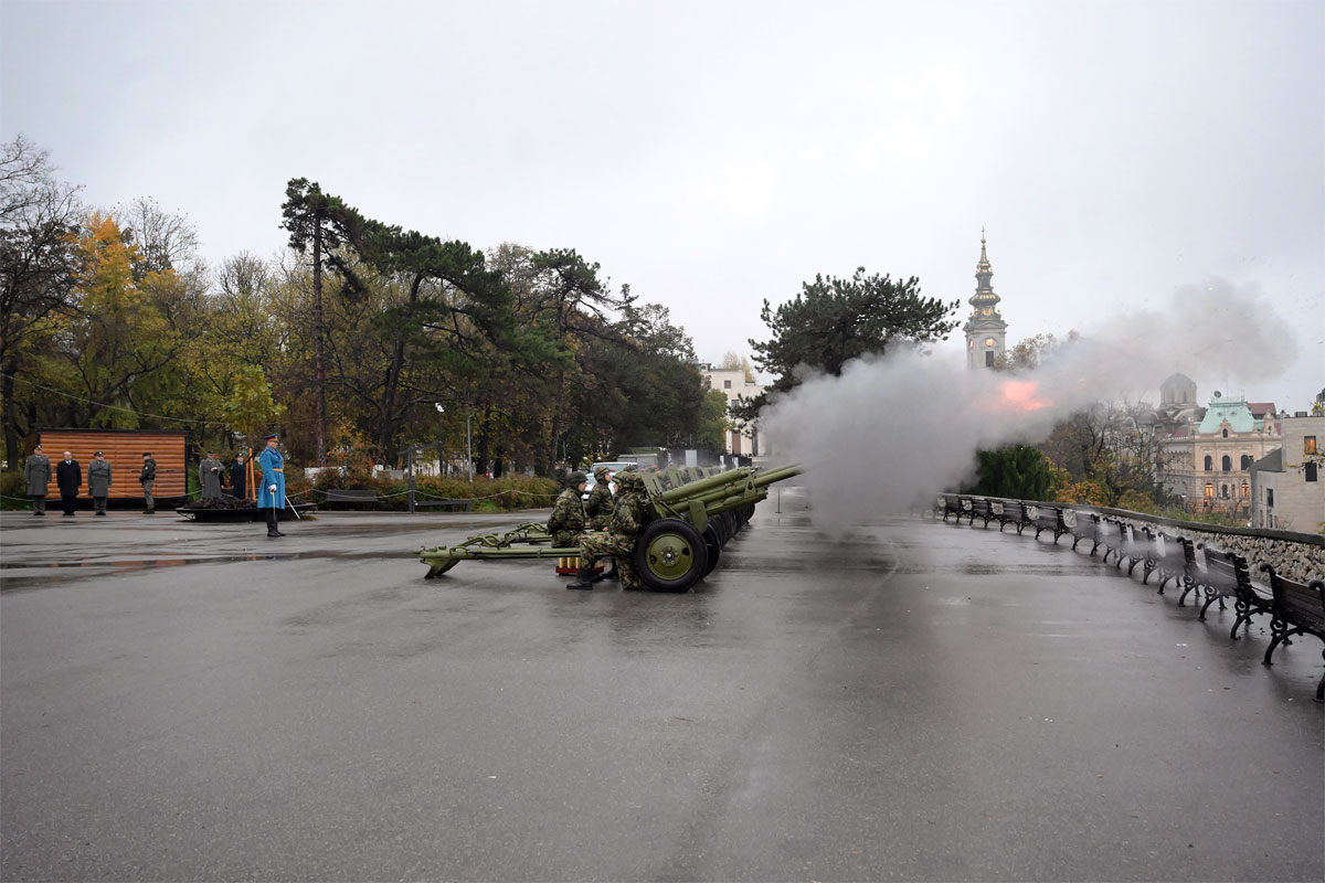 BEOGRAD: Povodom obeležavanja Dana primirja u Prvom svetskom ratu, pripadnici Garde Vojske Srbije izvršili su danas u 16.00 časova počasnu artiljerijsku paljbu ispaljivanjem 10 plotuna iz šest artiljerijskih oruđa sa Savske terase na Kalemegdanu.