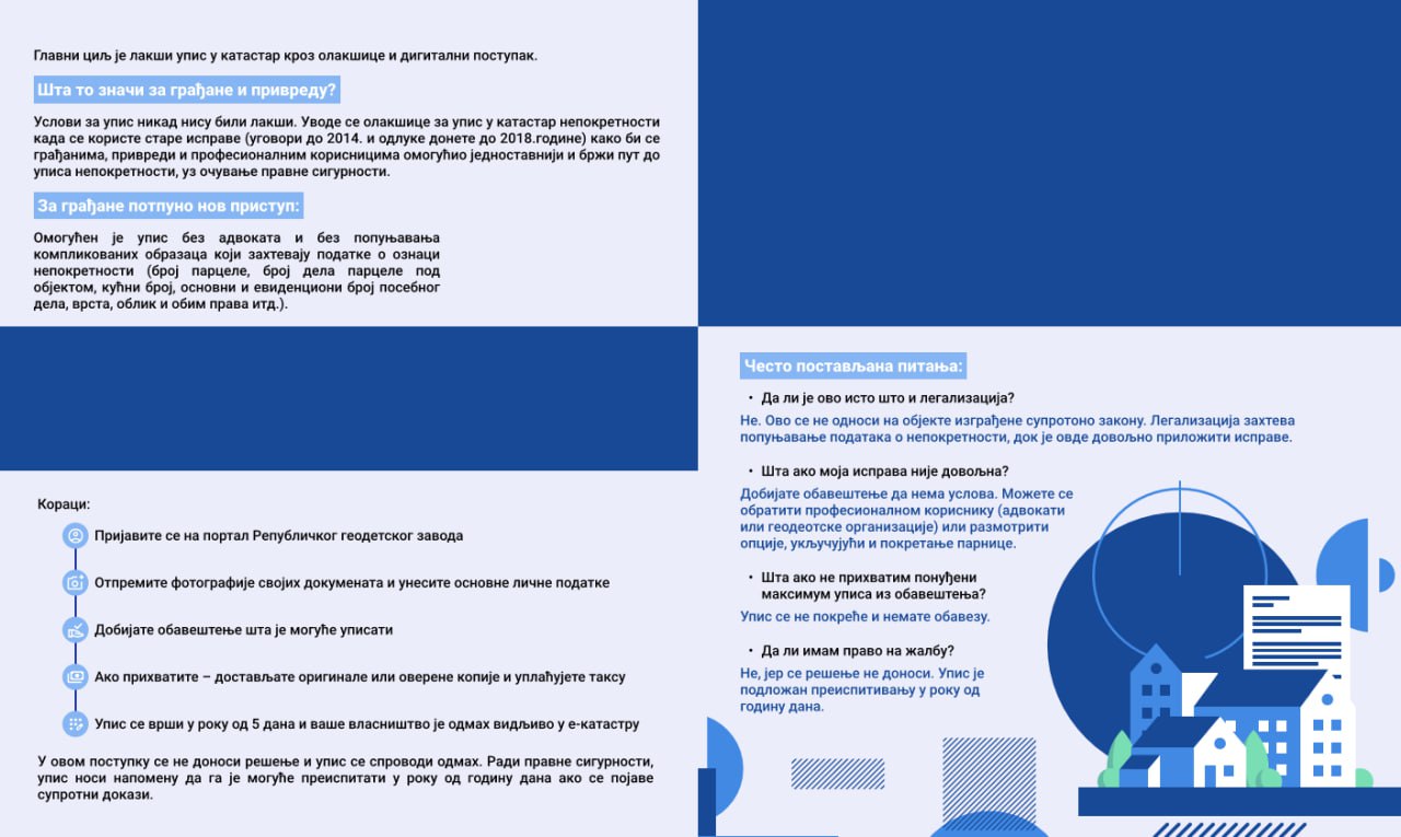 "Novim zakonom omogućeno je da se takve isprave priznaju i da se upis izvrši bez dodatne papirologije. Zahtev će građani moći da podnesu elektronski putem aplikacije Republičkog geodetskog zavoda, dostupne na sajtu RGZ-a počev od 1. januara 2026. godine. To znači da će svako moći da podnese zahtev samostalno, bez odlaska na šalter ili angažovanja advokata, čak i putem mobilnog telefona", navodi se u saopštenju RGZ.