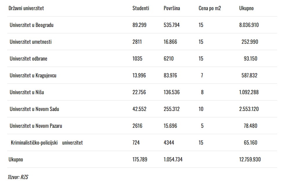 Dakle, procena je da iznajmljivanje objekata koje koriste državni univerziteti u Srbiji vrede od 10 do 15 miliona evra mesečno ili od 120 do 180 miliona evra godišnje.