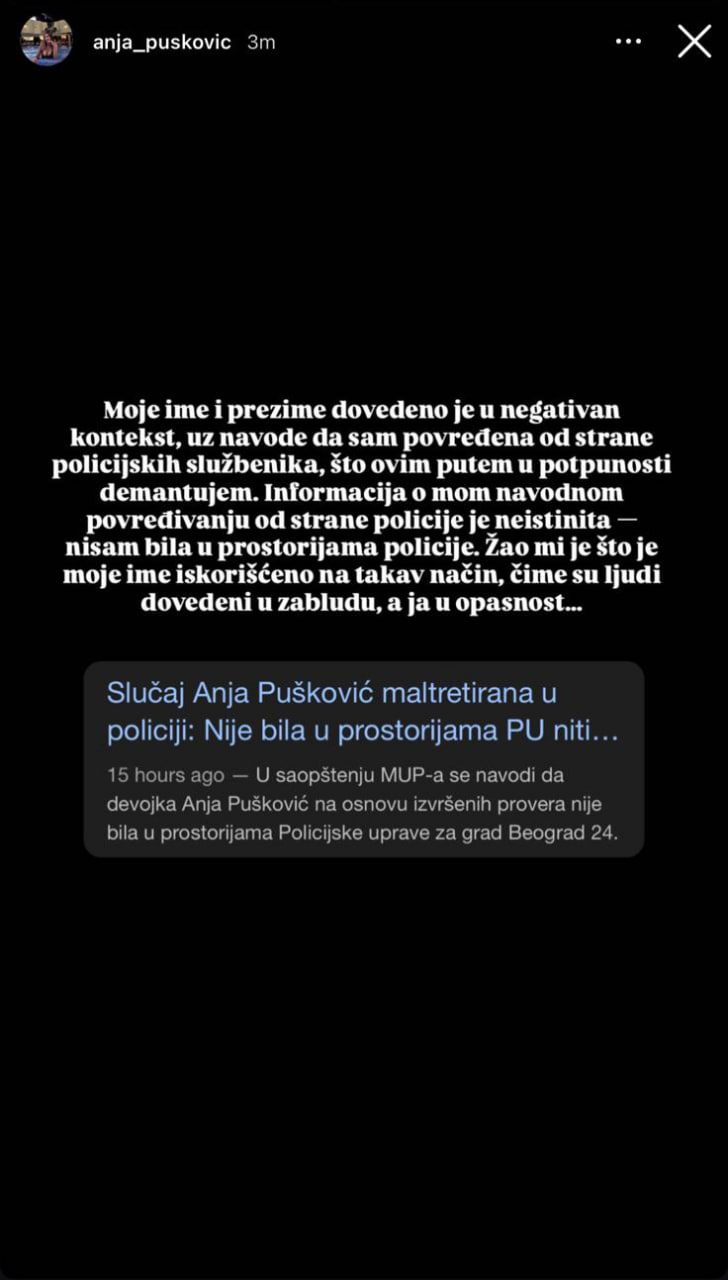 „ Moje ime i prezime dovedeno je u negativan kontekst, uz navode da sam povređena od strane policijskih službenika, što ovim putem u potpunosti demantujem. Informacija o mom navodnom povređivanju od strane policije je neistinita - nisam bila u prostorijama policije. Žao mi je što je moje ime iskorišćeno na takav način, čime su ljudi dovedeni u zabludu, a ja u opasnost…“