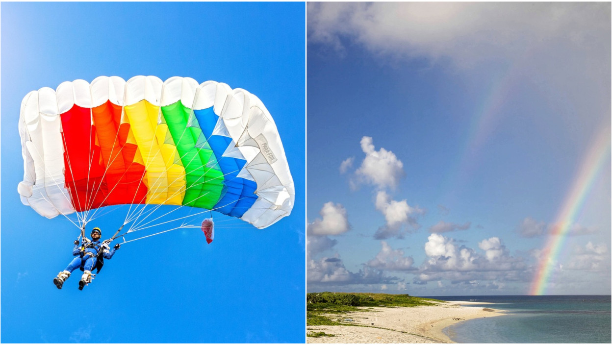 Снимак приказује тренутак када група уочава дугу, јединствени природни феномен док управљају својим падобранима како би га боље погледали.