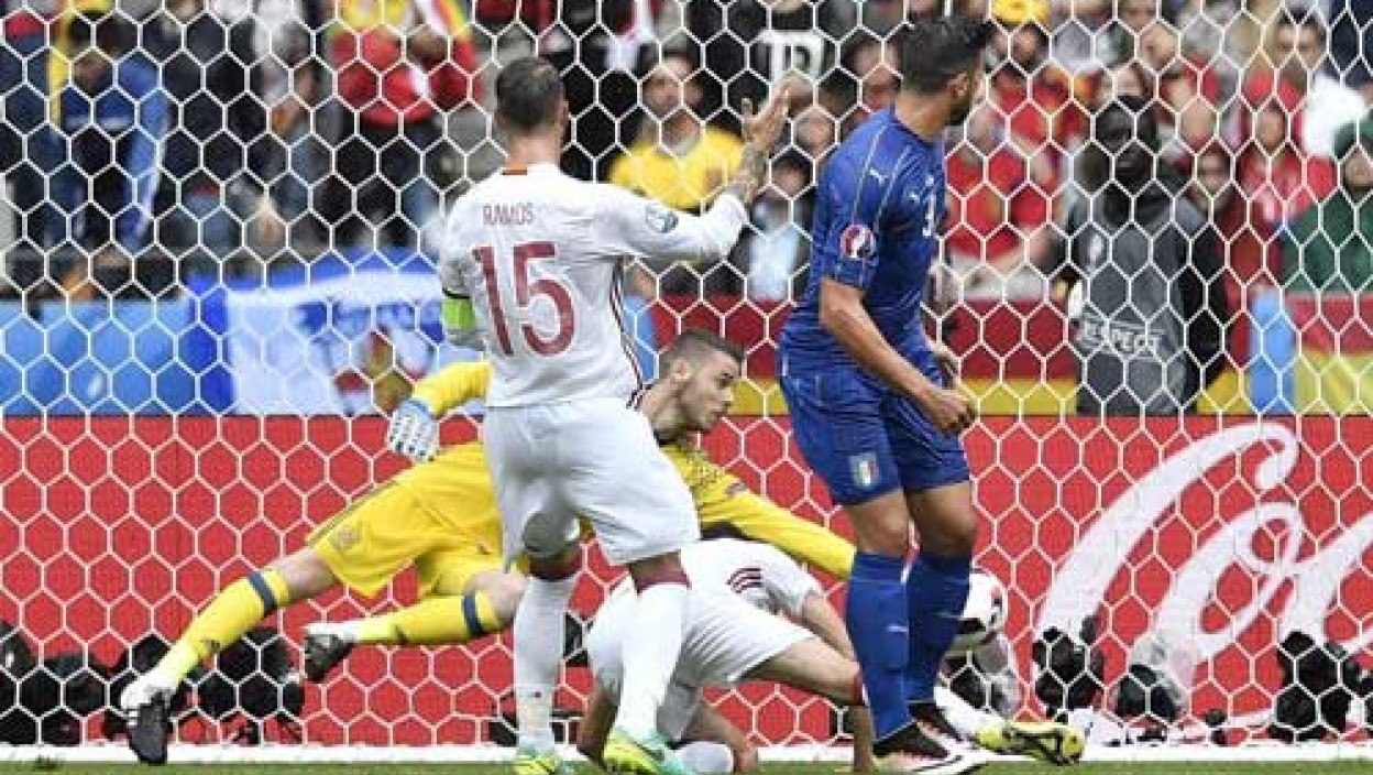 У 32. минуту Италија је извела слободан ударац по средини гола са око 20. метара, Едер је распалио по лопти, Де Хеа се одбранио од ње, а Кјелини је натрчао и погодио мрежу.