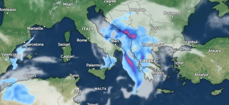 Од југа Италије до Грчке и Албаније очекују се грмљавинске олује, уз опасност од поплава и бујица. Очекује се да падне од 3о до 70 литара кише по квадратном метру, локално и више од 100 до 200 литара.