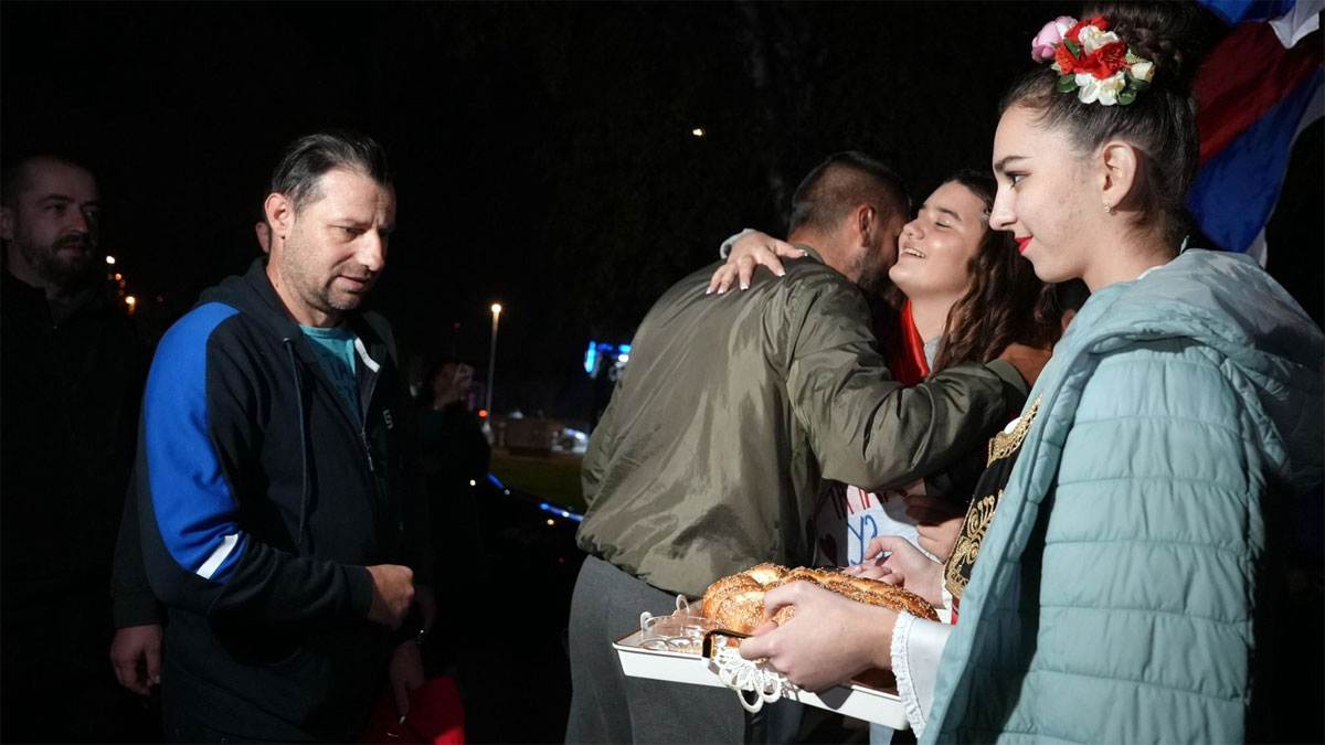 Они су нешто после 18 часова стигли у Прељину, где су мештани за њих приредили почасни шпалир, ватромет и поруке подршке, уз снажне емоције, загрљаје и сузе радоснице, али без музике и достојанствено, како и приличи, с обзиром да је сутра годишњица трагичног догађаја у Новом Саду.