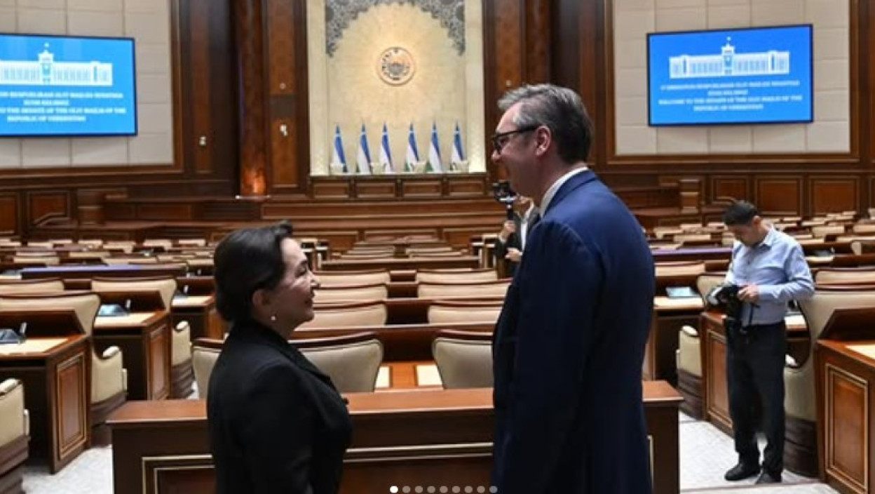 ТАШКЕНТ: Председник Србије Александар Вучић састао се данас са председавајућом парламента Узбекистана Танзилом Нарабаевом у згради парламента у Ташкенту.