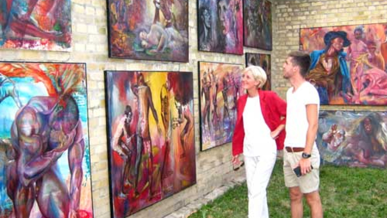 Поставка је била уприличена у необичном амбијенту, под ведрим небом у дворишту ауторкине куће, препуном разноврсног биља које је давало посебну драж изложеним сликама на којима је преовладавао колорит афричких мотива.