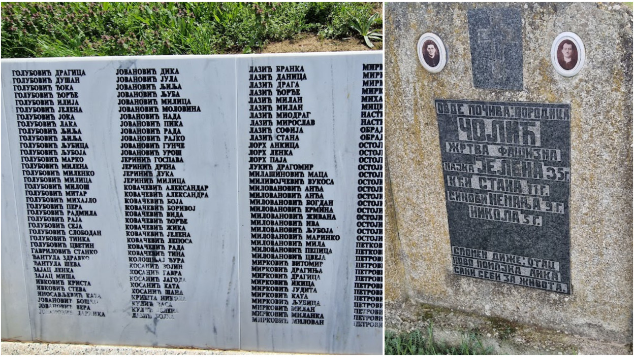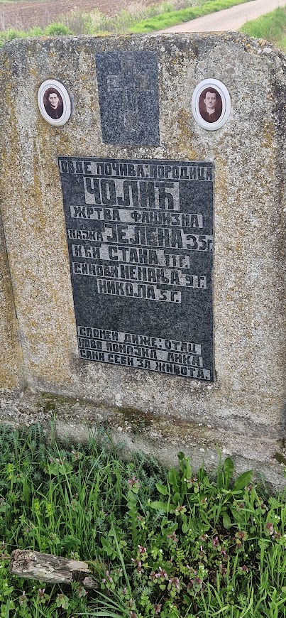 На месном гробљу пажњу ми привлачи споменик породице Чолић. Мајка Јелена је имала 35 година, ћерка Стана 11 а синови Немања и Никола 9 и 6 година. Све су их побили злочинци из Ханџар дивизије. Споменик су подигли отац Ново (који је вероватно за време масакра са партизанима био у Босни) и помајка Анка.